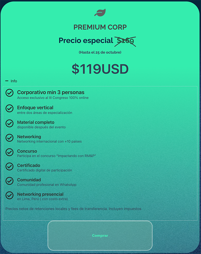 Opción de asistir al evento físico para fortalecer relaciones y alianzas (con costo adicional).