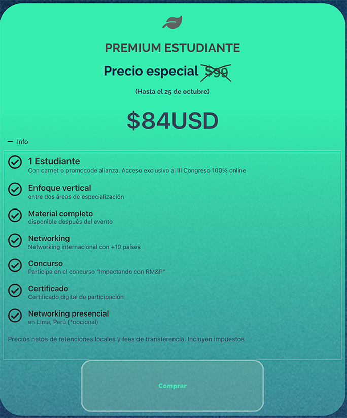Acceso opcional a un encuentro en Lima para fortalecer vínculos en persona con otros participantes y expertos del sector. ( CON COSTO EXTRA)